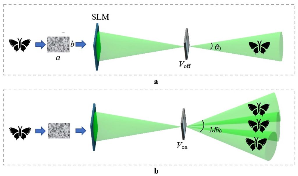(a)初始状态下的观看视角;(b)可调液晶光栅施加电压时的观看视角