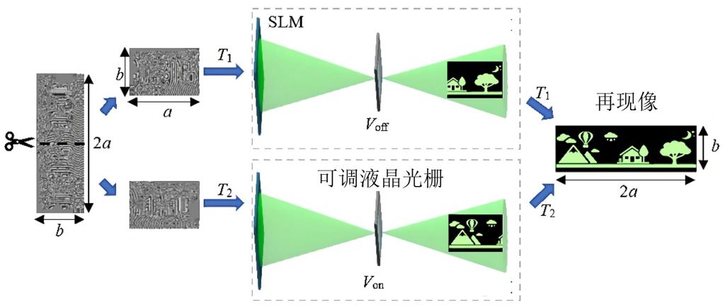 提出了基于可调液晶光栅的宽视角大尺寸全息3D显示系统。该系统利用可调液晶光栅对全息再现像进行二次衍射,并利用提出的两种全息图生成方法对应实现了宽视角和大尺寸全息3D显示。该系统的视角达57.4°,重建图像的尺寸扩大了约4.2倍。